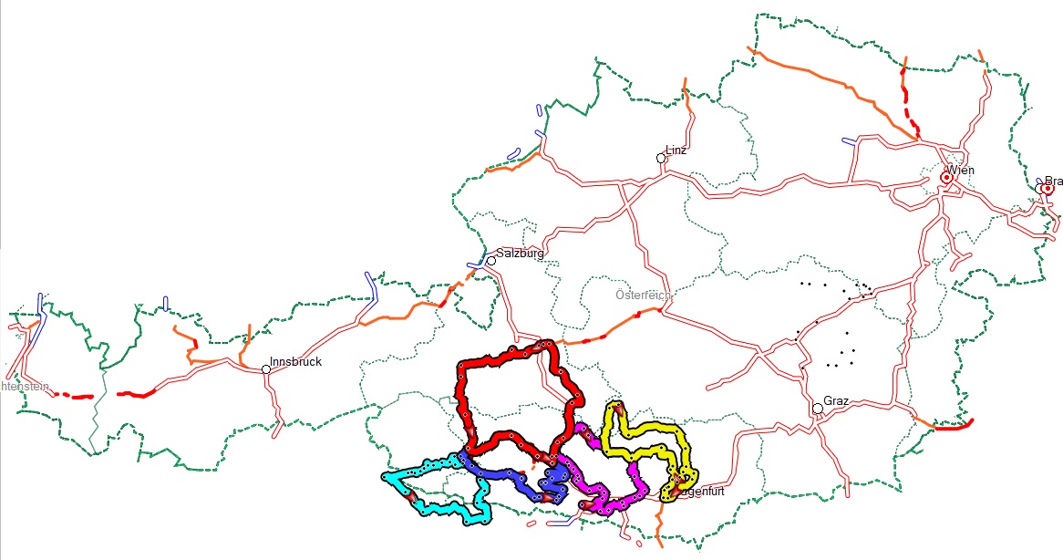 V případě č.7 ještě může dojít ke změně. Asi nejzajímavější část cesty na průsmyk - Passo di Monte Croce Carnico je z důvodu nestability skal uzavřena https://www.alpentourer.de/news/ploecke ... rung-2024/ . Pokud dojde do dovolené ke změně stavu, trasu upravím...