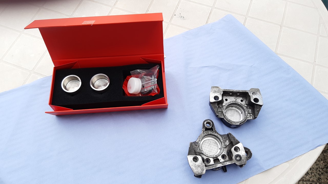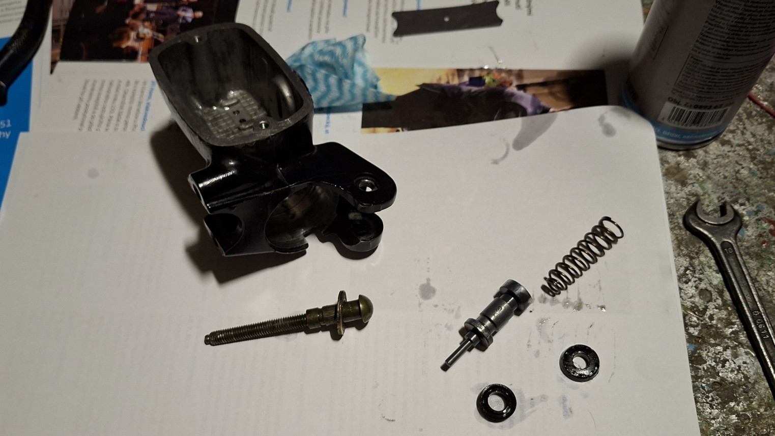 Teď sem se pustil do výměny těsnících kroužků v zadním brzdiči. Je to poprvé, co jsou ty pístky venku a není tam žádný humus. Dá se to udělat i bez rozpůlení brzdiče, ale já sem ho rozebral, abych mohl pořádně vyčistit (vyškrábat) drážky, ve kterých jsou usazené těsnící kroužky. Ty už byly ve velmi špatném stavu, rozpadaly se. Chtělo to udělat o něco dřív… Nové sem objednal na Wemoto za 570 Kč.