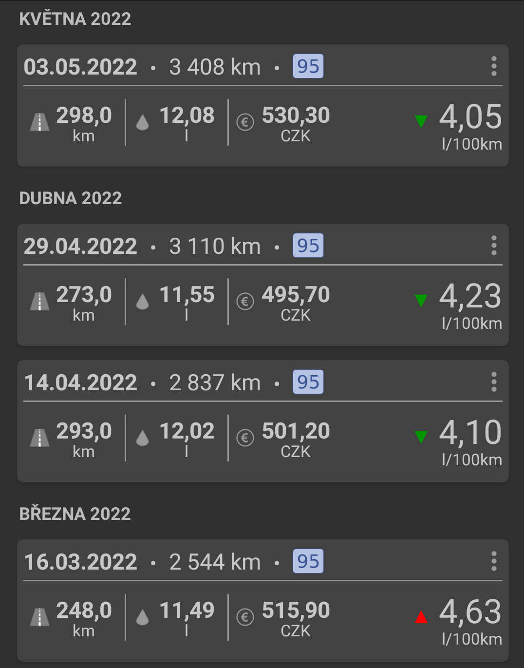 Displej motorky mi ukazuje za tyhle 4 nadrze (1112km) spotrebu 4,4 ...Appka v telefounu 4,24.