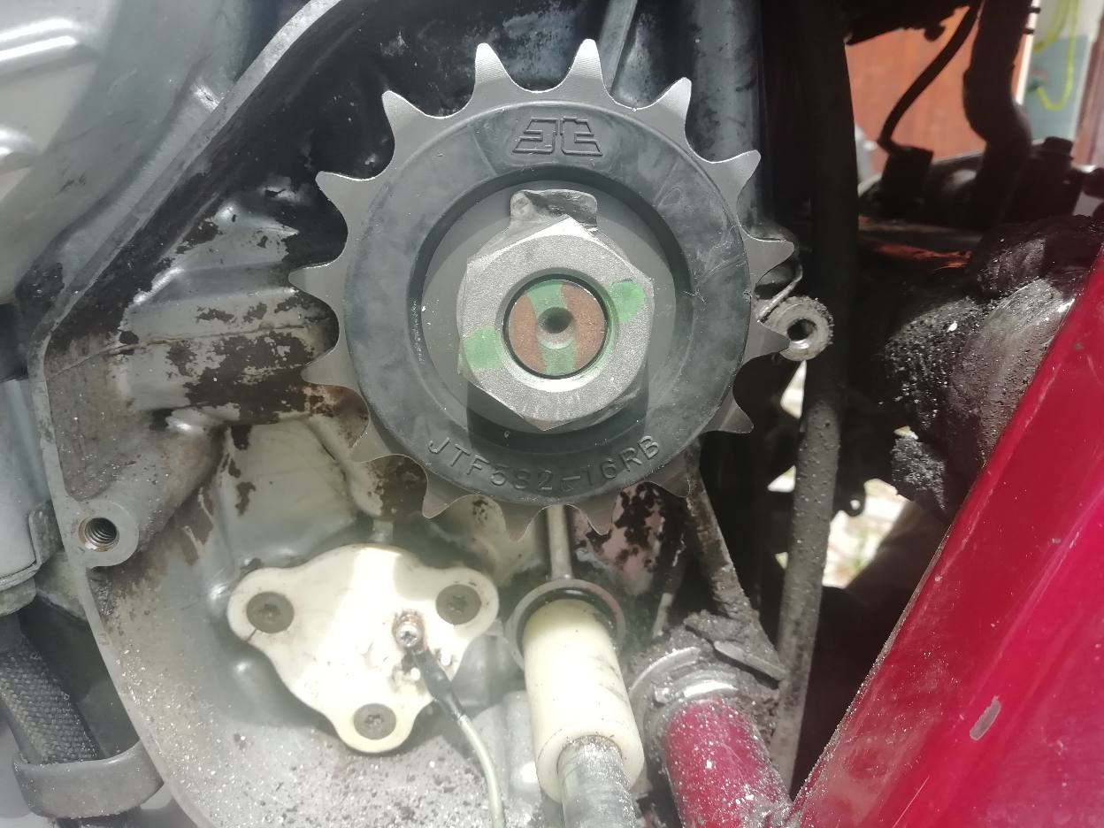 Další utažení bylo na 90Nm a lepidlo. To se asi půl roku nepovolilo, ale při výměně řetězovky jsem našel zase šupinku ze závitu. Nicméně na matici ani na hřídeli jsem viditelné poškození nenašel, tak nevím kde se vzala.